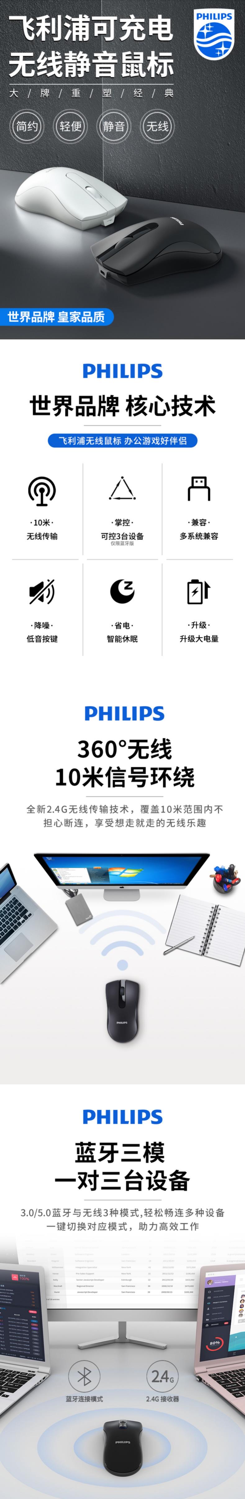 飞利浦无线鼠标可充电式蓝牙静音办公专用适用苹果笔记本台式电脑