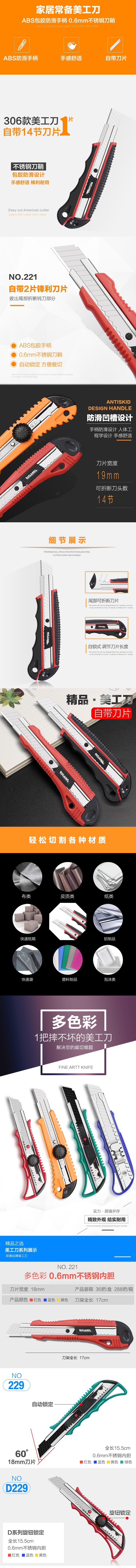 • 颜色分类: 日钢221美工刀 日钢223美工刀 日钢229美工刀 日钢228美工刀 日钢306美工刀 日钢211美工刀 日钢D229美工刀-带螺旋钮 日钢D223美工刀-带螺旋钮 日钢全铁小美工刀9mm 日钢9mm塑料小美工刀 169加大美工刀-25mm宽 9mm宽刀片-10片价 18mm宽刀片-10片价 25mm宽刀片-10片价 全铁美工刀 18mm宽 日钢103 加大美工刀-25mm宽-带螺旋